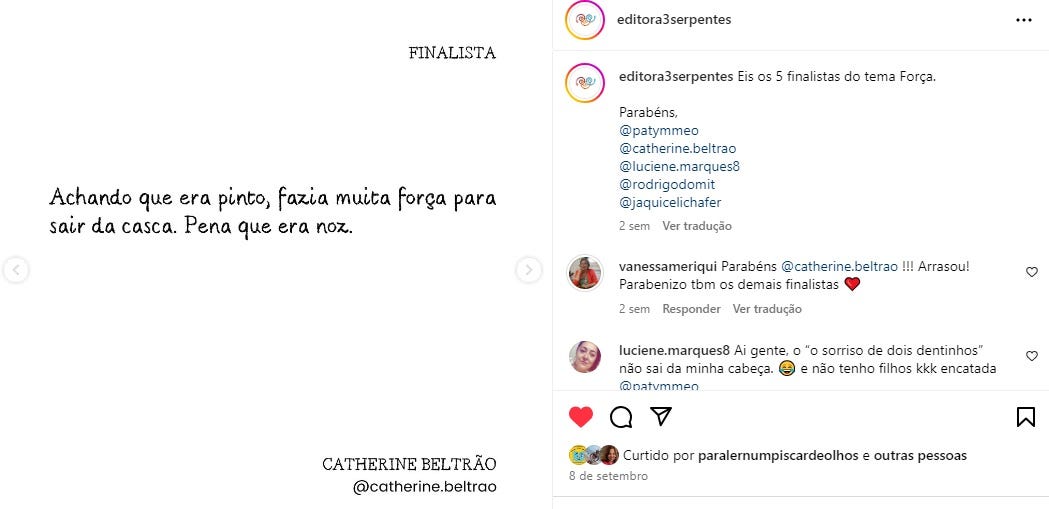 Recentemente, em agosto, participei de um concurso: o 6ºCampeonato de Microcontos da Editora 3 Serpentes. Foram mais de 5.000 inscrições de microcontos, agrupados em 12 temas! Fui finalista com o tema Força.